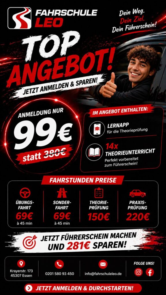 Unsere hohe Bestehensquote von 95 % in der theoretischen und praktischen Prüfung steht für qualifizierten Unterricht, engagierte Fahrlehrer und eine individuelle Vorbereitung. Wir begleiten unsere Fahrschüler professionell, sicher und zielgerichtet bis zum erfolgreichen Führerscheinabschluss.